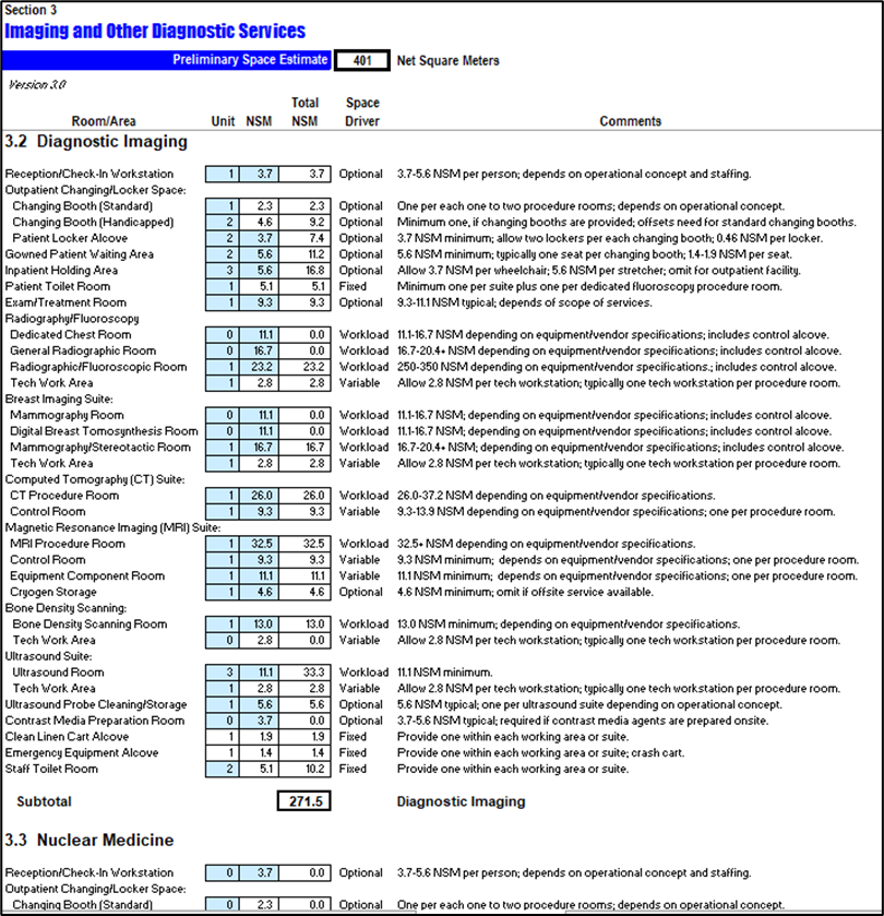 | Space Requirements | Number, type, and size of rooms; grossing factors; growth allowances |